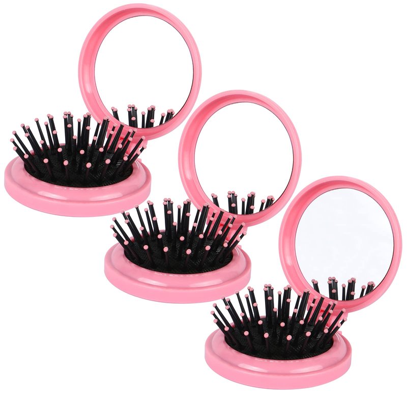 TOSAMZOO 3PCS Folding Travel Hair Brush with Mirror, Mini Comb/Wet Brushes, Compact Purse Pocket Hair Massage Combor for Women and Girls(Pink)