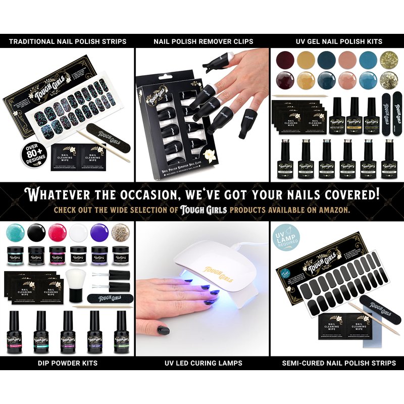 Whether you are going out on the town, working in the office, catching a class, dishing out dinners, or tucking in little ones, TOUGH GIRLS offers beautiful and affordable nail polish strips to accent any outfit or event. With over 60+ designs available, TOUGH GIRLS offers one of the widest selection of today's trendiest colors and designs. TOUGH GIRLS salon-quality nail strips are brighter, thicker, and tougher, consisting of a top coat, color coat, base coat, and non-toxic adhesive layer. With our easy-to-apply and long-lasting strips, you'll not only impress your family and friends, but you'll also have the opportunity to save time and money in the process. You just might wonder why you ever went to the nail salon in the first place! Stay Smart. Stay Strong. Stay Beautiful. Stay Tough! ***Tips for best results: 1) Store/use at room temperature 2) Use immediately after opening 3) Avoid heavy soaking of nails (showers, baths, swimming, hot tubs, dishes, etc.) for first 6-8 hours 4) Apply nail strips prior to bed – allows adhesive to set 5) Do not allow strips to hang over nail front edge - file clean to nail edge to avoid getting caught on hair, clothes, sheets, etc. 6) Do not overstretch nail strips – may cause color/design distortion or bubbling 7) Buff/smooth ridged nail surfaces to help avoid tiny air bubbles 8) Apply clear topcoat for added protection 9) Sunscreens/lotions may cause strips to become tacky 10) Do not apply strip over cuticle or skin - may cause peeling around those edges***