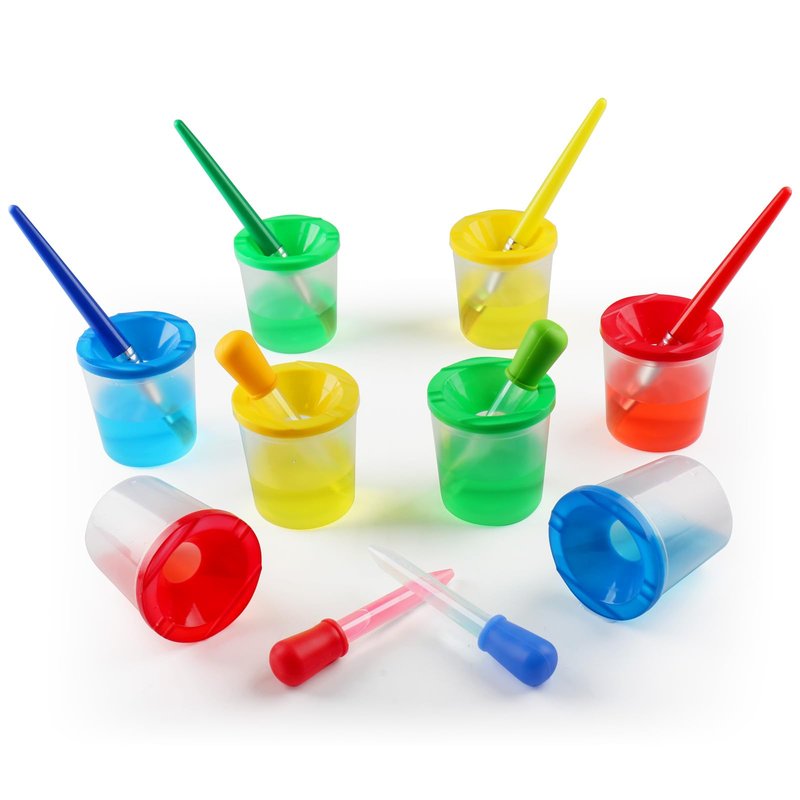 - High Quality & Durable: Liquid droppers are made of high-quality silicone and plastic, while the spill-proof paint cups are made of high-quality plastic. All the tools are safe and durable. Kid-friendly sizes, toddlers can easily grasp the paint brushes and liquid droppers