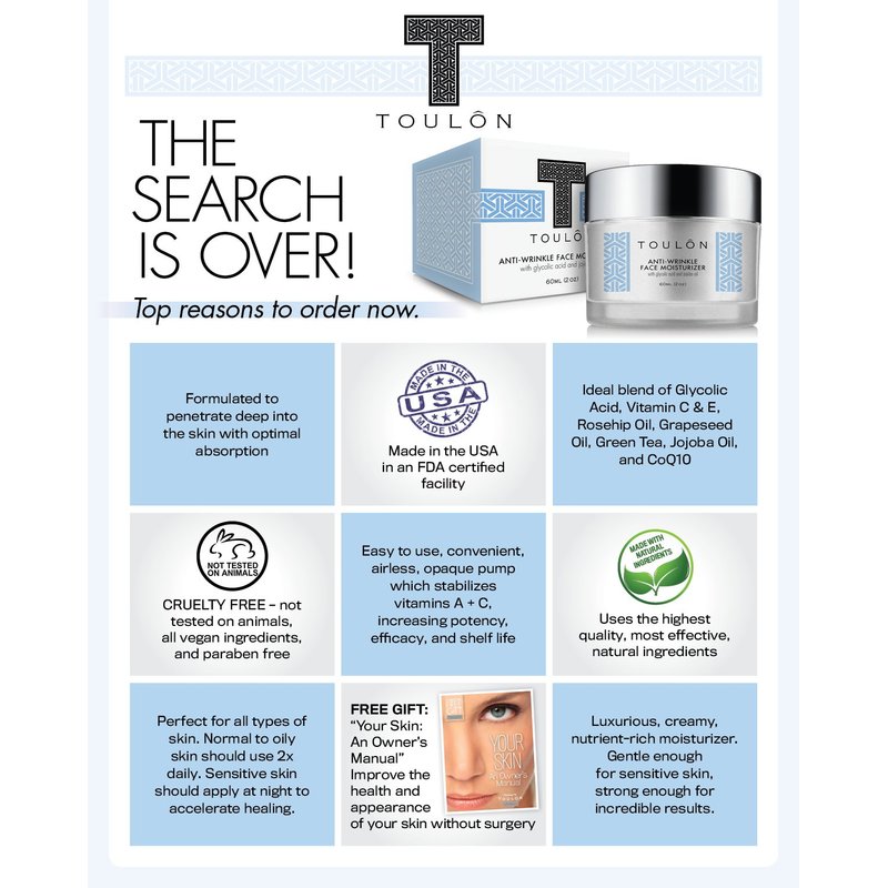 - VERSATILE: Perfect for All including Sensitive, Oily, and Thin Skin. Anti-Aging Creme & Moisturizer in One. Penetrates the Skin to Hydrate and Deliver Potent Nutrients. By Removing the Barrier of Dead Cells, it Allows Other Treatments like TOULON’s Vitamin C Serum with Hyaluronic Acid to Penetrate Deeper.