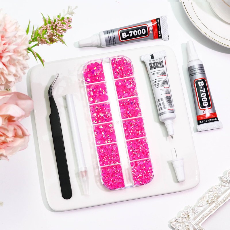 - 🌺 Quick Bedazzler Kit: The resin rhinestone and b7000 glue kit is easy to use, you can use glue to stick rhinestones to any surface, it drys clear with strong adhesive, drying time is 6-10 minutes, giving you enough time for minor adjustments after the glue is applied, dry totally after 24 hours. Our glue is waterproof, it adheres to a variety of materials with great adhesive, locks gems in place with amazing hold, works on metal, plastic, glass, ceramics, wood, fabric, leather, etc.
