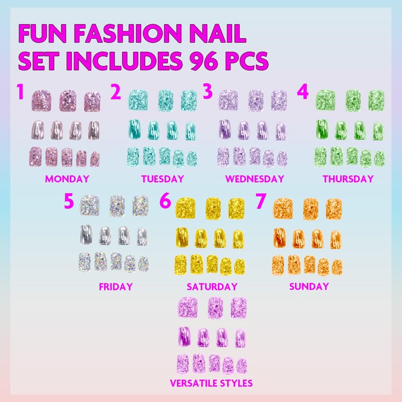 Here's a one-stop shop to all the glitz and glamor in trendy nails. With 96 press-on nails, the possibilities for different nail looks are endless. Life gets more and more hectic by the day, so who has time to spend hours in the salon? So let’s bring the salon home to you! If you want your nails to make a statement, this Glitter and Glam 96 PK Press-on Nail Set will give you the most original manicures ever!