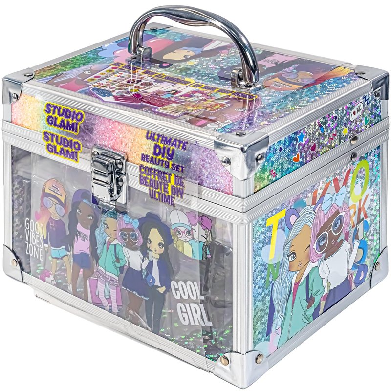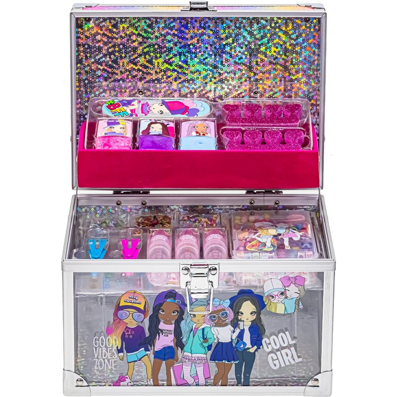 - Train Case Includes 1 Acrylic Train Case W/ Fun, New Glam Art. 2 toe spacers, 1 box of assorted beads for bracelet, 1 pack of strings for bracelet, 1 sheet of gemstone stickers, Alphabet stickers, 1 nail sticker sheet, 1 3D sticker sheet to accessorize hair clips, 1 sheet of glitter tattoos, 6 hair clips, 3 bubble gum scented nail polishes in pink, purple & light blue, 1 nail file, 3 roll-on lip glosses, 1 bag of floating beads, 1 bag of floating fruit icons, 1 bag of floating sprinkles.