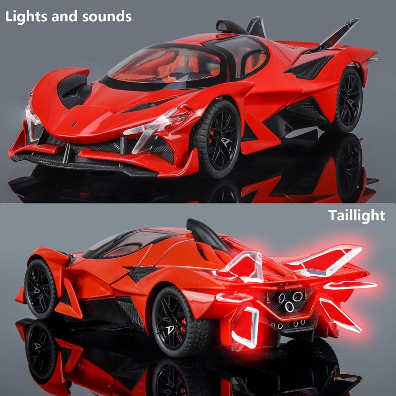 - Dynamic Design and Detail: Equipped with simulated seats, steering wheel, dashboard, and other features, it is like a miniature cockpit. The gull-wing doors swing open, revealing a stylish interior, while the adjustable spoiler adds an aerodynamic touch, giving the toy car a sporty and futuristic appeal.
