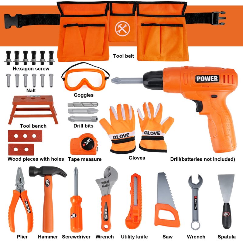 - Pretend Play Construction Tools Set - These Kits include a battery powered electric toy drill, kids tool belt, needle nose pliars, hammer, screwdriver (flathead and phillips), clamp, anchors screws, gloves, measuring tape a piece of play wood and safety goggles.