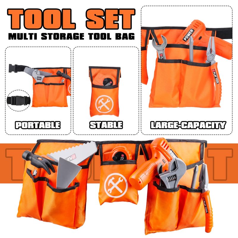 - Upgraded Tool Belt for Kids - The kids play tool belt is made of high fiber, high elastic and thick fabric, and is mended with tight stitches. It is also reinforced with multiple top lines, which makes the boys tool belt last longer. The bag has 7 storage Spaces, 2 large Spaces for small parts and 5 for hanging tools accessories.