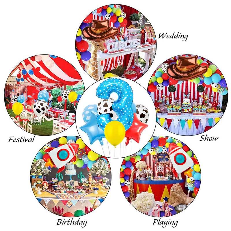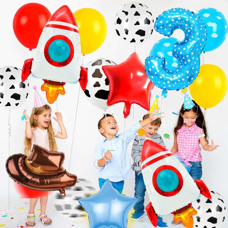 - Packing List: 13 PCS in total, 1 rocket balloon, 1 cowboy hat balloon, 1 number balloon, 2 star balloons, 6 colourful latex balloons, 1 ribbon and straw