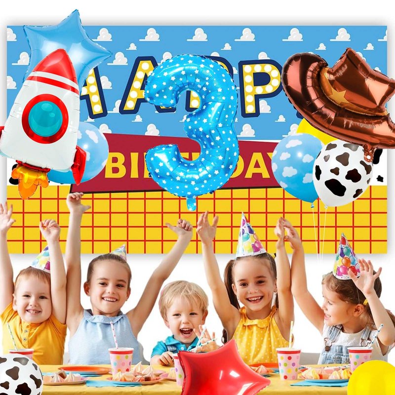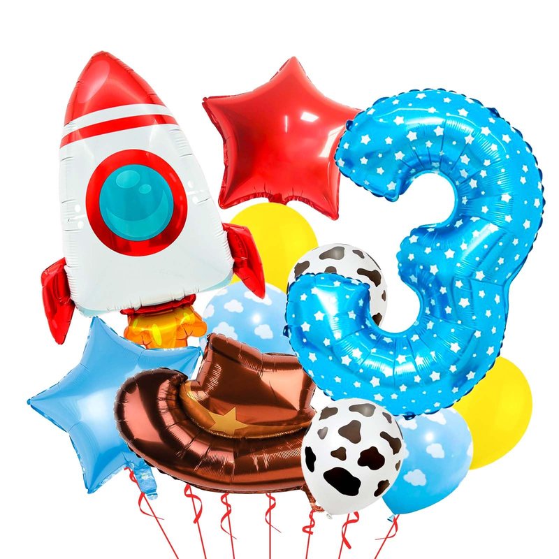 Toy Themed Number 3 Balloon, Happy Birthday Balloon, Colorful Balloons with Rocket Balloon and Cowboy Hat Balloon, Rainbow Balloons for Kids Birthday Party (3)