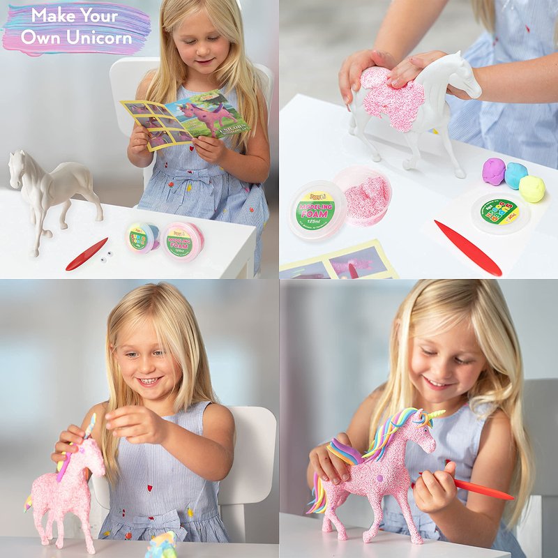 - 🦄 Modeling clay arts and craft for kids, unicorn crafts contains one unicorn figure, kid-friendly and safe modeling foam, super dough, eyes, sculpting tool and instructions to craft your own unicorn.