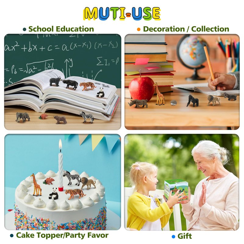 - β AWESOME SAFARI ANIMAL CAKE TOPPER - There are many mini zoo animals, it would be a good idea to use them as the cake toppers and make a safari animals-themed cake for your kids. Such cute & different varieties of animal figures are worth to be collected, decorating children's bookcase, desk and room. It's an awesome birthday gift or prize for kids, they would love that so much.