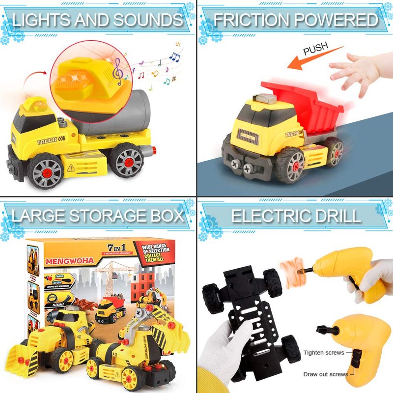 - 7 in 1 take apart toy car: The construction vehicles toy set including Lights &Sounds for even more exciting experience, Toy Power Drill for taking apart the truck models and putting them back together, Push & Go technology for extra play-ability while providing countless hours of indoor angers outdoor fun. Build 7 precious construction trucks with the 71 pieces, which develops their hands-on ability.