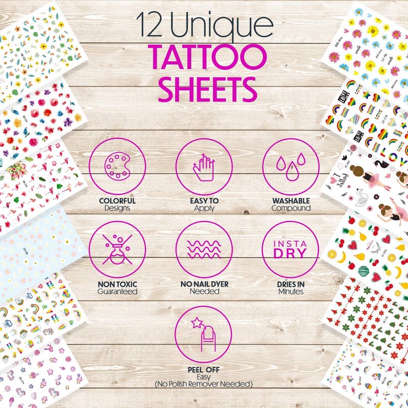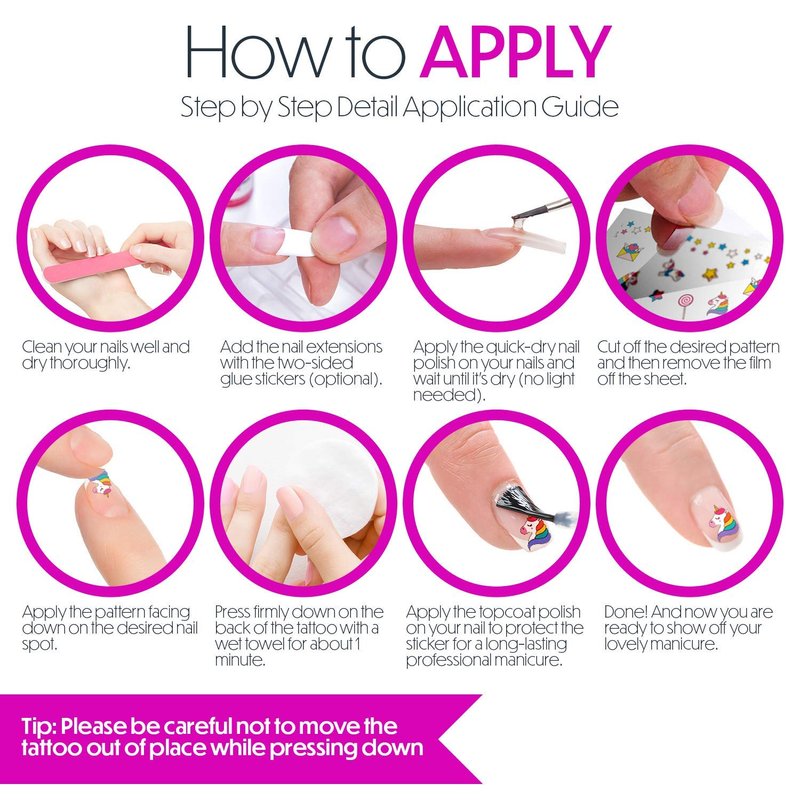 - NO NEED TO GO TO THE SALON! - Who said you had to go to a salon to be a princess? Apply these adorable unicorn-themed tattoo nail art stickers, paint her nails, and watch that glow emerge.