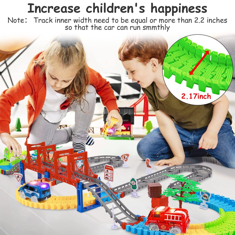 - š [Fourfold Happiness] 4 different colors of light up track cars can attract kids' attention and make them feel happy. Parents can interact with kids and toddlers, boys and girls by choosing track cars, and acting as a driver of three different functions. Race track cars can not only be enhanced family relationships but also educated children about traffic safety by these track cars