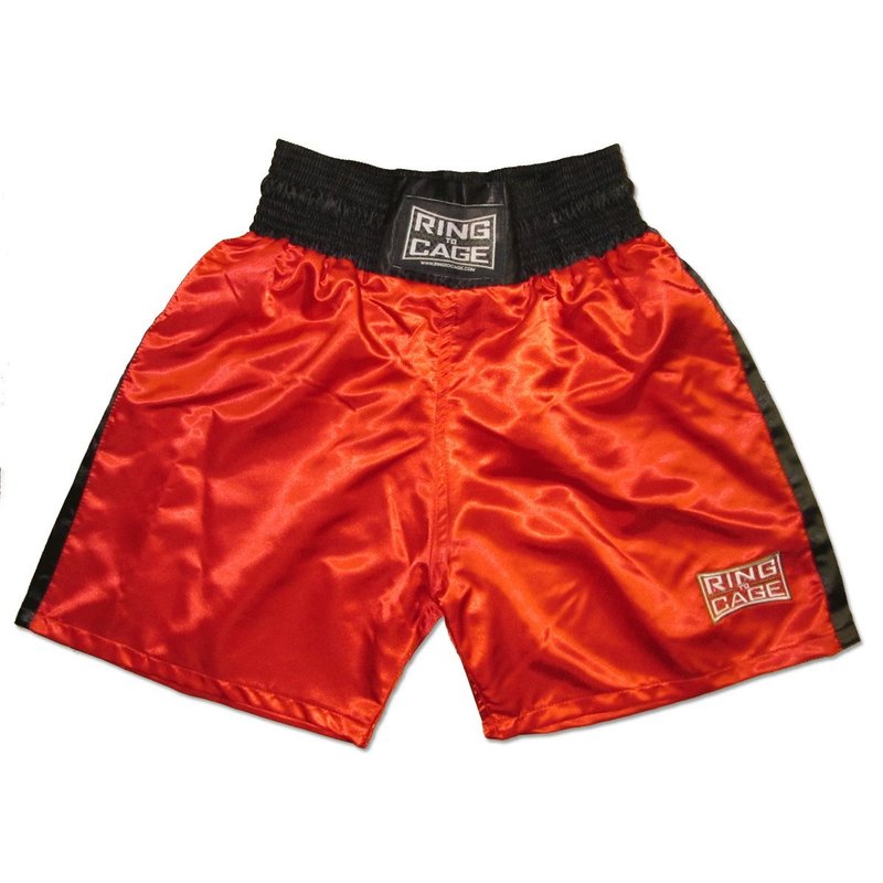 Traditional styling, soft and lightweight satin trunks. Can be used for boxing, kickboxing, and Muay Thai. 4" waistband. Machine washable. Full cut to accommodate protective cup. Hidden drawstring inside the waistband. Embrioded RING TO CAGE logo on left leg.