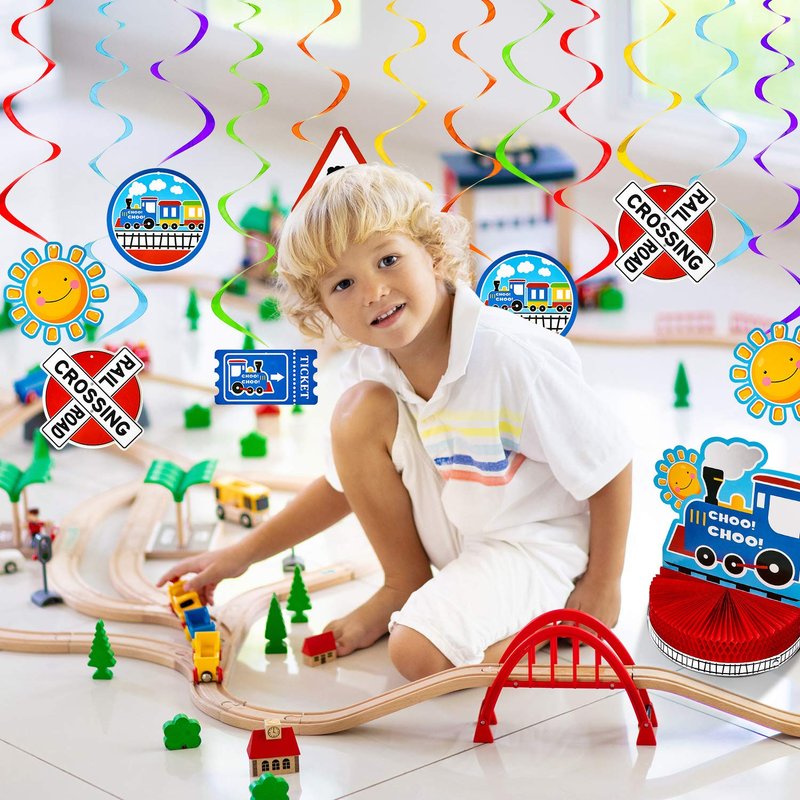 - What you get: the train birthday party decorations set includes 1 piece train honeycomb table centerpiece, 1 piece birthday banner, 6 pieces hanging swirl decoration, this novelty combination can catch people's eyes easily, enough quantities and diverse pattern can meet your party decoration needs