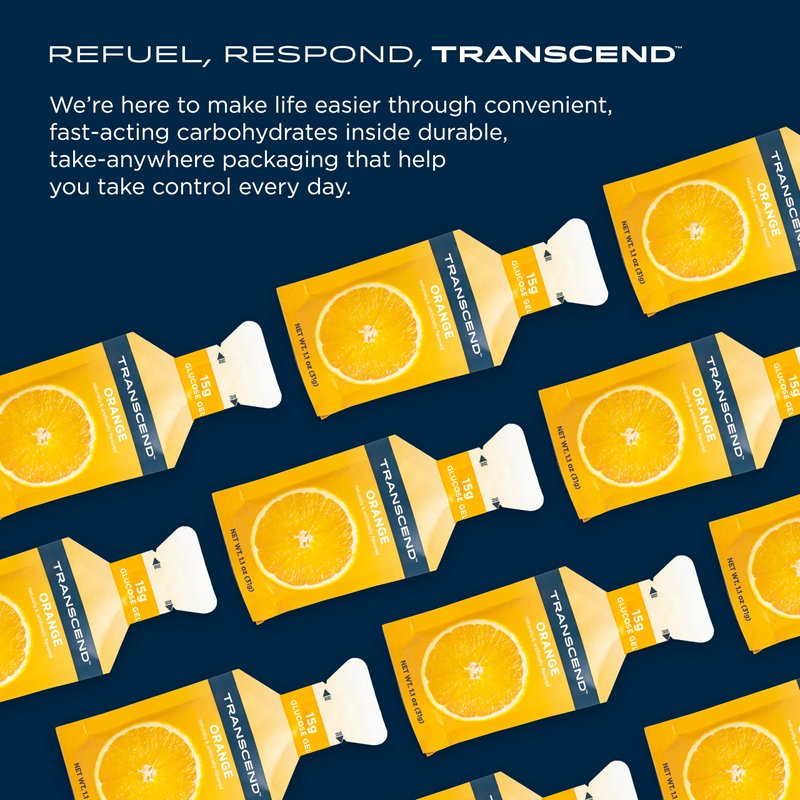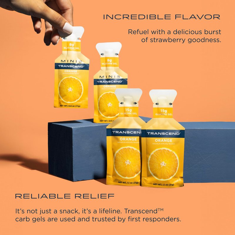 Our Transcend Foods Orange Gel 10-Pack is designed with precision and taste in mind. Each pack delivers a delicious burst of orange goodness, packed with fast-acting carbs — exactly what you need for effective refueling. Created by someone living with T1D, we understand the need for a reliable, portable solution: enter endurance gels. This product isn't just a snack; it's a lifeline. Our products offer convenience like no other, trusted by first responders to be easily accessible to tackle those unexpected lows. Whether you're a parent prepping for your child's school day, an athlete, or just an individual on the move, don't let a low interrupt your day—stash a Transcend Foods pouch in your bag, purse, or pocket and keep moving forward, fueled and ready for anything with energy gels.