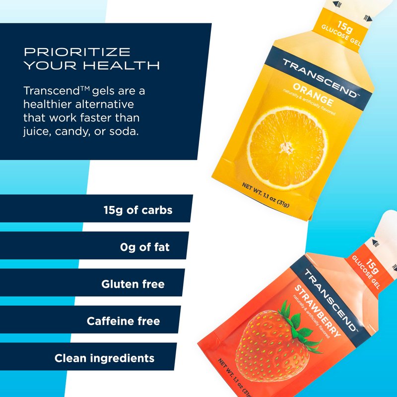Our Transcend Foods Strawberry + Orange Gels 10-Pack (5 Strawberry, 5 Orange) is designed with precision and taste in mind. Each pack delivers a delicious burst of sweet goodness, packed with fast-acting carbs —exactly what you need for effective refueling. Created by someone living with T1D, we understand the need for a reliable, portable solution: enter endurance gels. This product isn't just a snack; it's a lifeline. Our products offer convenience like no other, trusted by first responders to be easily accessible to tackle those unexpected lows. Whether you're a parent prepping for your child's school day, an athlete, or just an individual on the move, don't let a low interrupt your day—stash a Transcend Foods pouch in your bag, purse, or pocket and keep moving forward, fueled and ready for anything with energy gels.