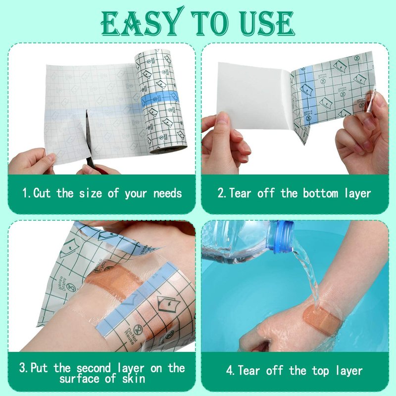 - Waterproof and practical : cover your skin from external friction and water to better grow an new intact skin; You can also use the adhesive bandage after you get a tattoo,the transparent stretch tape allows you to shower or swim as usual