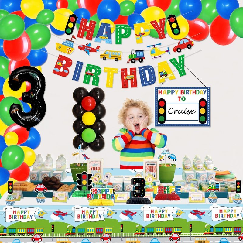 - Package Includes: 1 x HAPPY BIRTHDAY banner, 1 x transportation theme garland, 1x DIY name hanging sign, 1 x transportation theme tablecloth, 1 x balloon decoration strip, 3 x balloon flower clips, 4 x table centerpieces(3, THREE, traffic light, HAPPY BIRTHDAY), and a number 4 foil balloon, 11 x transportation theme cupcake toppers, 75 x latex balloons(black, yellow, red, green, black, 15Pcs/color), come with ribbons and glue points.