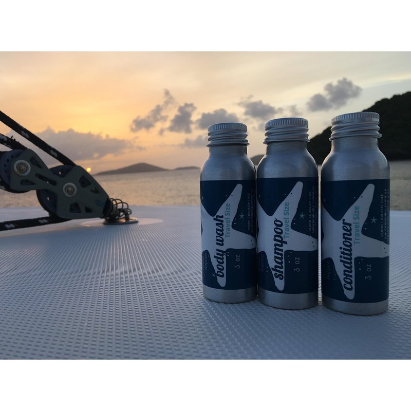 - Includes 2.5 oz of shampoo, 2.5 oz of conditioner, 2.5 oz body wash. Bottles can be refilled with our 16oz products.