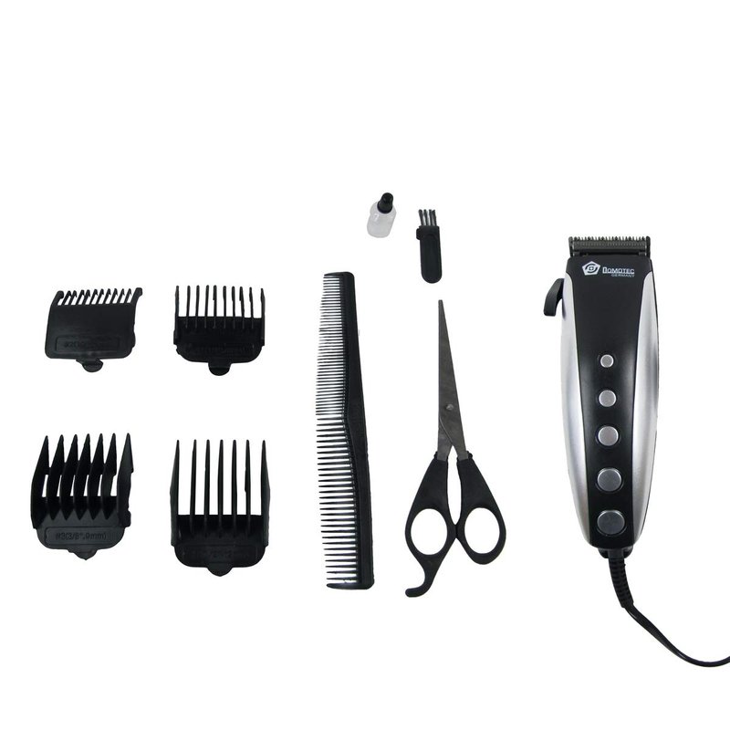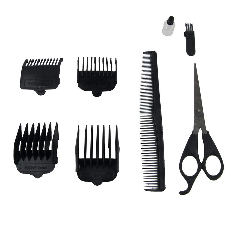 - Haircut/beard trimmer kit includes 9-pieces: clippers, scissors, 4 length attachments, scissors, oil, blade brush, styling comb