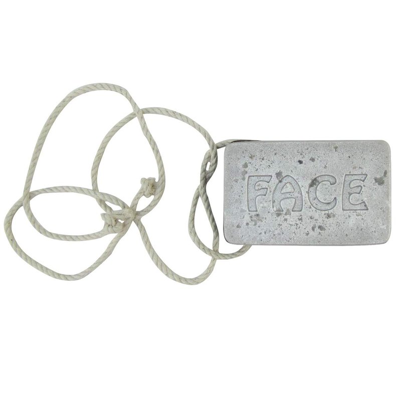 - "FACE" is imprinted on they grey bar while "BUTT" is engraved on the colored brown soap