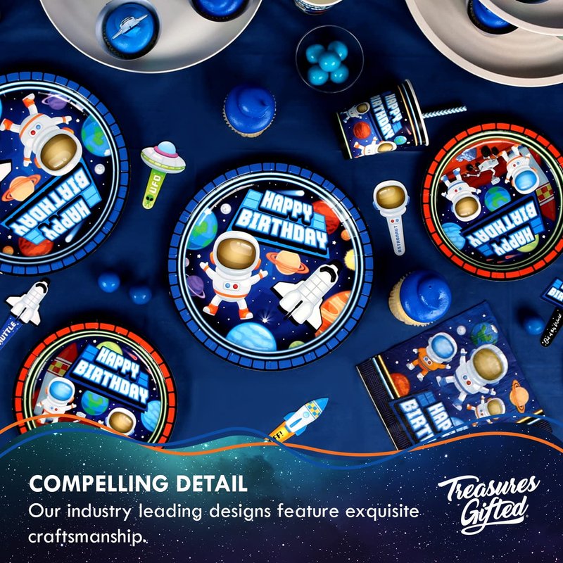 - Get more galaxy themed party supplies and other party accessories! Check out the Treasures Gifted Amazon store for more products such as space party supplies, outer space plates, alien balloons, and outer space happy birthday banners!