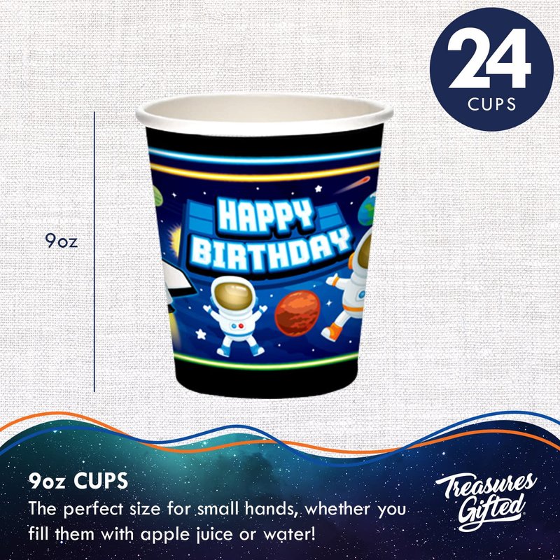 - Blast off on a fantastic space adventure with our space cups. Our galaxy decorations are out of this world with designs featuring space shuttles, rockets, & planets. These space party cups make clean up a breeze!