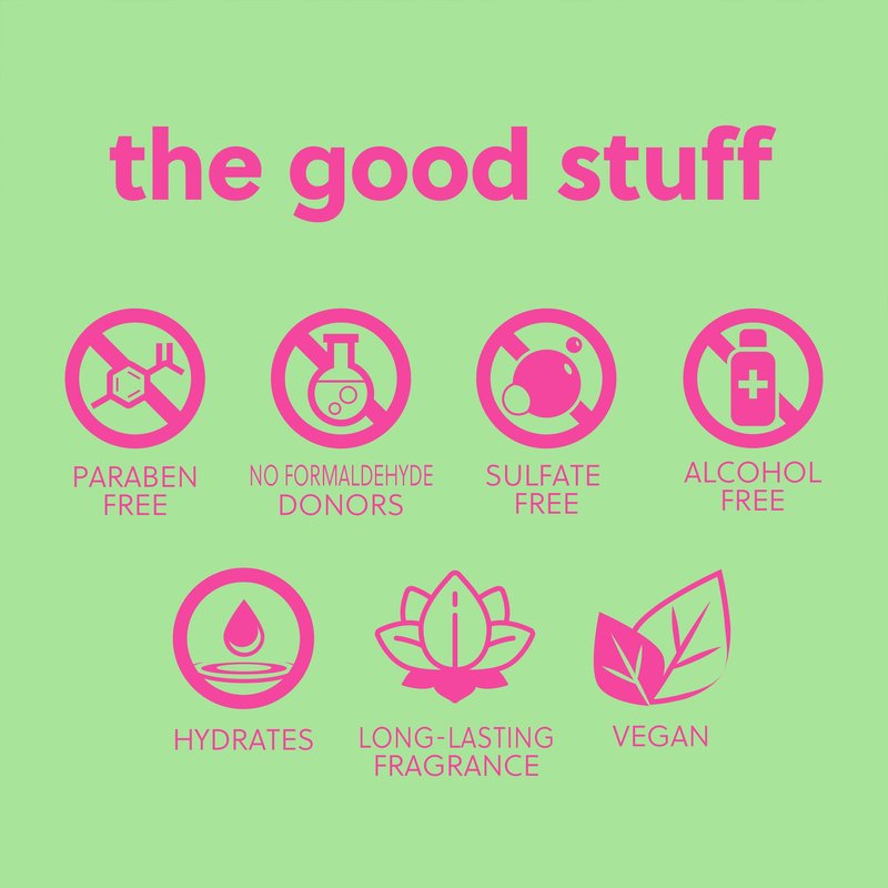 - Paraben-free, vegan, sulfate-free, contains no formaldehyde donors and has a long-lasting fragrance in a medium-weight formula