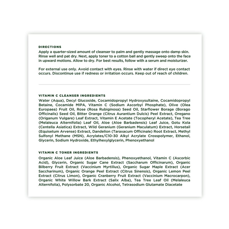 A SYNERGISTIC BLEND of highly Natural and Organic ingredients is specifically designed for comfort and ease of use while offering impressive cleansing and toning properties. Our Vitamin C Cleanser complemented by our Vitamin C Toner is specially formulated for use with all skin types, and it helps skin feel refreshed the moment it is used.
