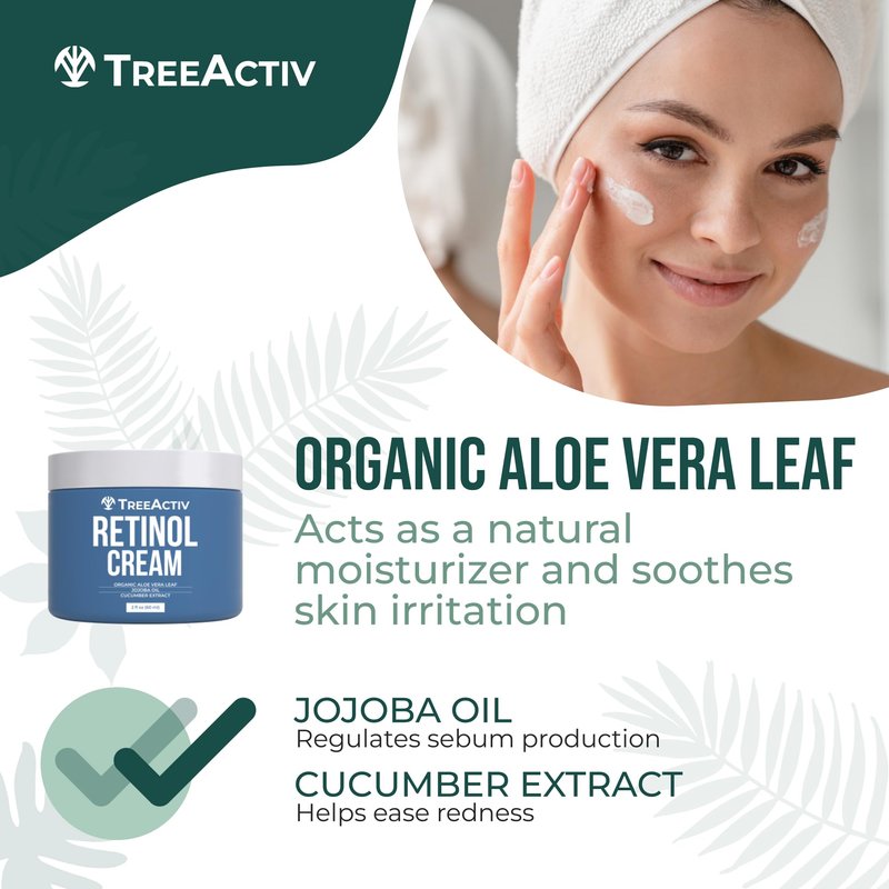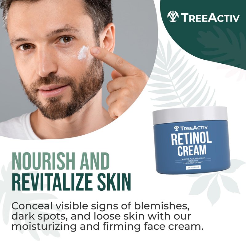 Introducing TreeActiv Retinol Cream, the ultimate night face cream for women anti aging, retinol lotion, antiage face cream for women, wrinkle cream, and anti wrinkle cream for face for those seeking a great retinol product. This luxurious anti aging face cream for women, anti aging retinol, and anti aging face is formulated with a potent blend of ingredients, including pure retinol, Aloe Vera, Jojoba Oil, and Marula Oil. With its hydrating and skin-tightening properties, this retinol cream works wonders as anti wrinkle face cream for women, body cream with retinol and hyaluronic acid, anti-wrinkle cream, anti wrinkle face cream, wrinkle cream for face deep wrinkles, and wrinkle cream for women in minimizing the appearance of deep wrinkles, fine lines, and age spots.