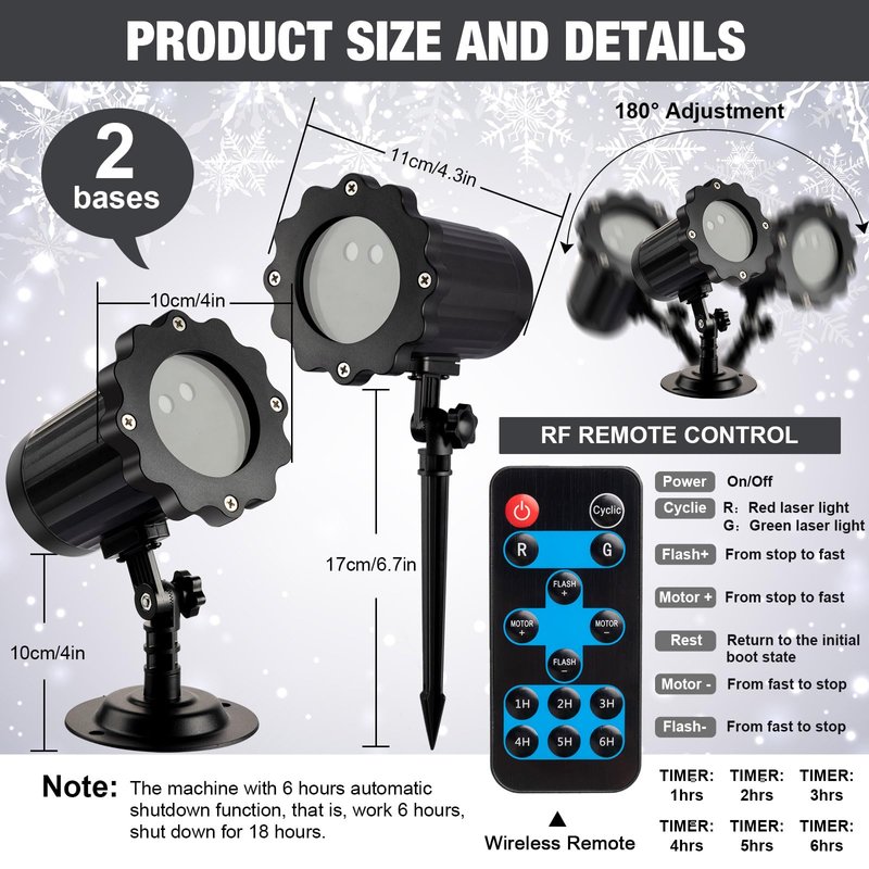 - Easy to Use: just install the base or long ground stake and connect the plug, then you can use the Xmas display projector lights; It can be inserted into the ground, or placed directly on the ground or installed on the wall by replacing it with a round base; The remote included in the package can work within a range of 50 ft, and according to the instructions, you can use it freely adjust the mode and work time of the projector lights
