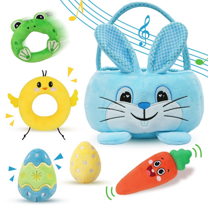- PACKAGE INCLUDES: You will get a blue Easter basket stuffers for babies playset, including an Easter egg toy, a carrot toy, a chick toy, a frog toy, a yellow egg toy and a soft blue plush bunny basket. The Easter bunny basket is designed with lining and circle bottom. Cute and lovely Easter baskets, add a great Easter festive atmosphere to your baby's first Easter celebration.