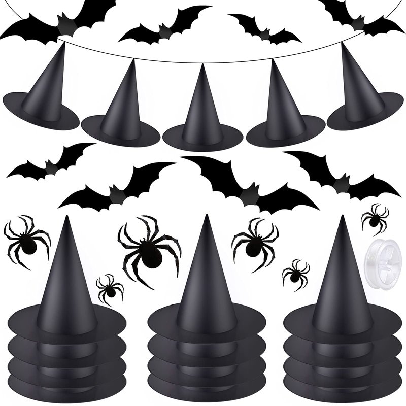 12PCS Black Halloween Witch Hat with 52PCS 3D Spider Bat Wall Decal Stickers 100 Yards Hanging Rope, Witch Costume Accessory Party Favor for Halloween Party Cosplay Decoration