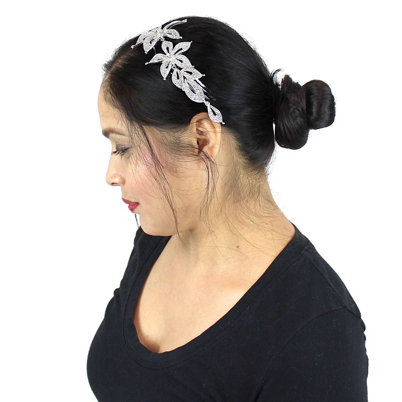 Add fancy embellishments to your hairstyle with this striking triple level of hair combs, the combs are connected layered in levels to ensure secure placement in your hair. It has a dangling leaf ornament. Silver flowers and leaves are accented with sparkling crystals for absolutely stunning style. Dimension: 2.3"L x 2.5"W widest flower and the sizes cascades down. Material: Metal and Rhinestones. Colors: Silver