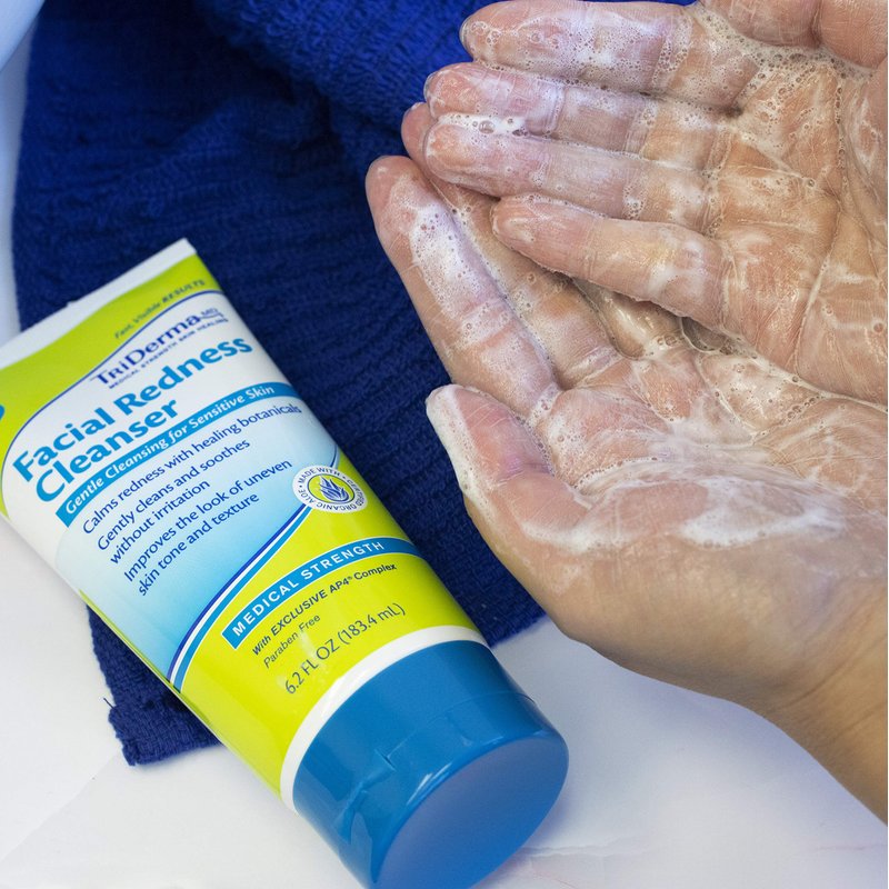 - Gently cleanse irritated skin, reduce the look of redness and help improve uneven skin tone with TriDerma's Facial Redness Cleanser! Specially formulated for the face and upper chest, this cleanser won't agitate your complexion and can be used on all skin types.