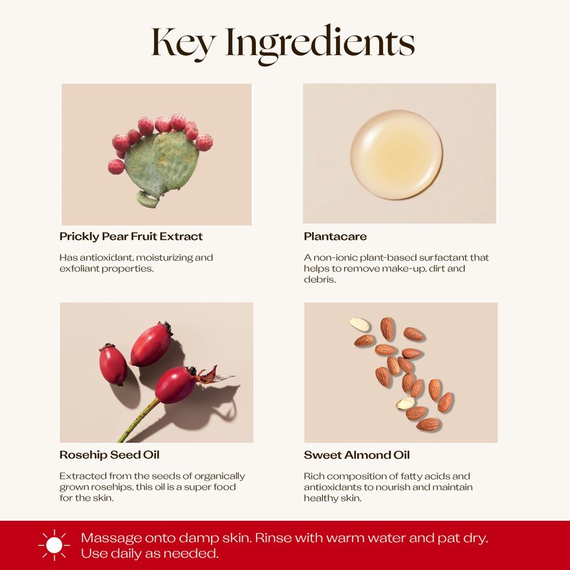 - Gentle Yet Effective: A luxurious cream cleanser that combines rosehip oil with Prickly Pear to deeply cleanse without stripping