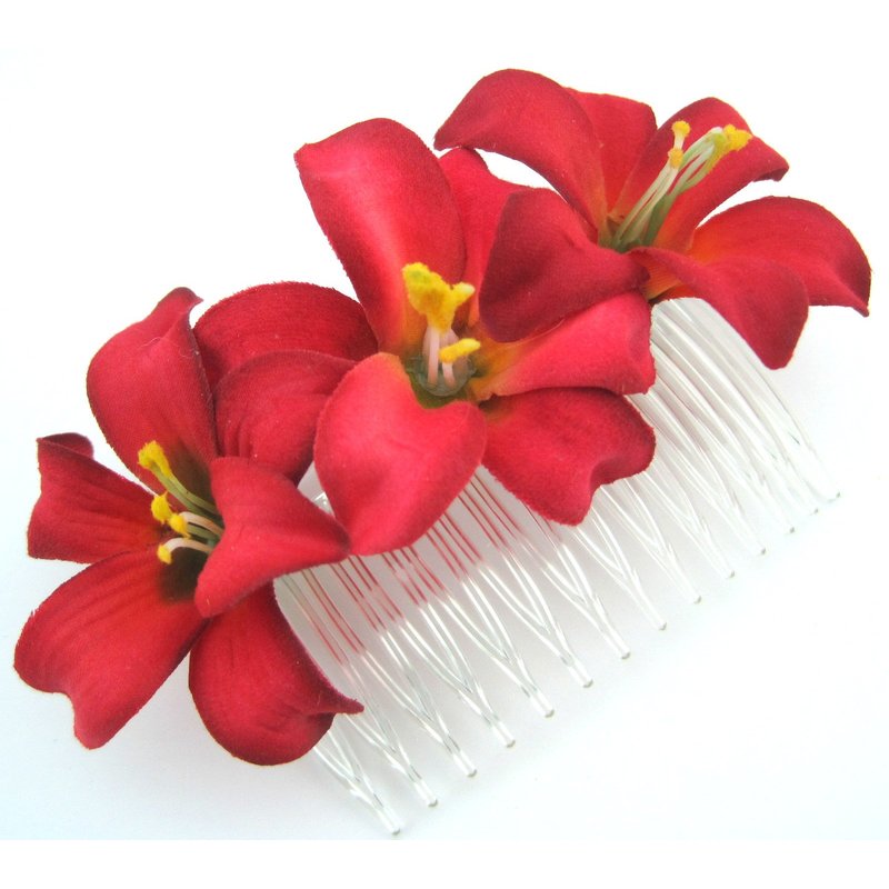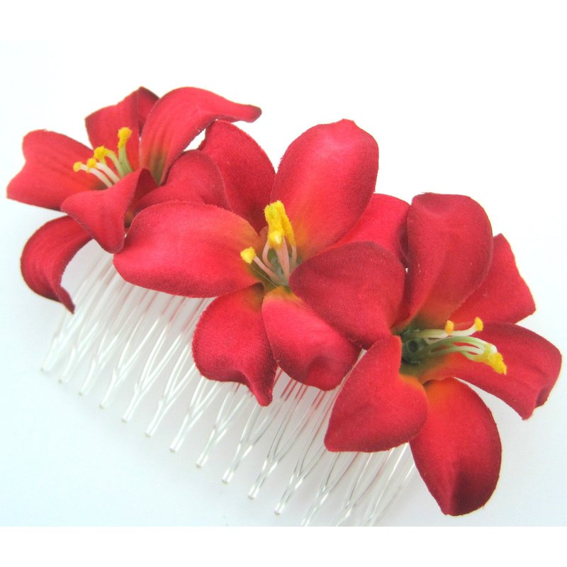 - Triple red lily silk flower hair comb