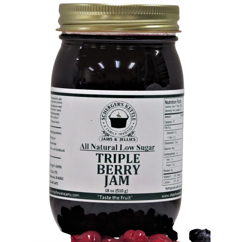 Our Amish made Low Sugar Triple Berry Jam is produced one small batch at a time to preserve the natural fruit flavor. Each bite of our homemade jam easily identifies the particular fruit used because it contains no artificial ingredients or preservatives. Our all natural low sugar jam contains at least 70% fruit. What a delicious healthy choice. Close your eyes, take a bite and savor the taste of pure fruit.
