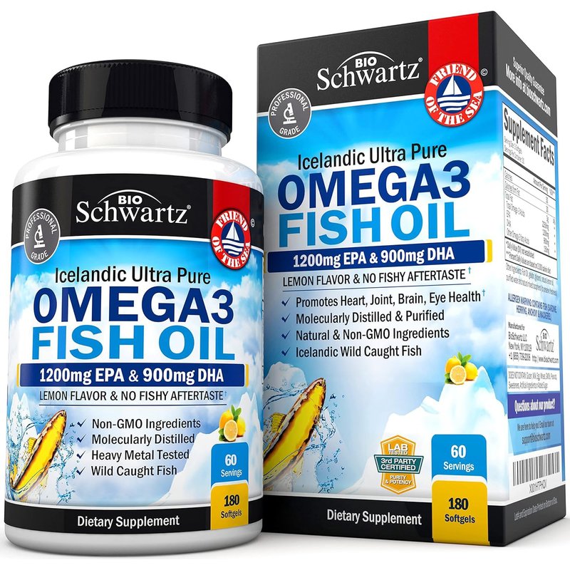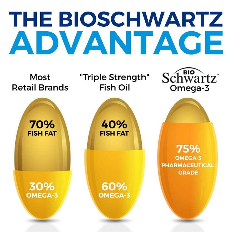 Why Choose BioSchwartz Fish Oil Omega-3 Supplement? BioSchwartz Omega-3 Fish Oil is one of the most potent omega supplements on the market, rich in the Omega-3 Fatty Acids associated with a wealth of health benefits*, including Support Healthy Joint Function* May Help Improve Joint Pain and Stiffness*, Help Reduce Inflammation* Promote Healthy Eyes, Skin & Hair. Highest Potency Fish Oil Pills Extremely Potent Omega-3 Fish Oil 3000mg, with a total of 2250mg Omega-3 Fatty Acids including 1200mg EPA, 900 mg DHA, and 150mg other Omega-3 Fatty Acids per serving. Most Advanced Fish Oil Supplement with NO Fishy Aftertaste Supercritical extraction ensures our Omega-3 pills provide one of the safest and best forms of Omega-3 Fatty Acids, eliminating oxidation, fishy aftertaste, and unpleasant fishy burps. Third Party Tested to assure the highest quality and purity of our Omega 3 capsules. Natural & Pure Formula Contains NO GMOs, artificial ingredients, fillers, binders, or preservatives. Our formula is FREE of milk, egg, corn, wheat, peanuts and sugar. Advanced Formula Our Premium Omega-3 Fish Oil is formulated by doctors and manufactured in the USA following strict GMP guidelines. Our premium supplements are produced from the finest raw materials and under stringent quality control standards to ensure the highest quality supplement is developed.