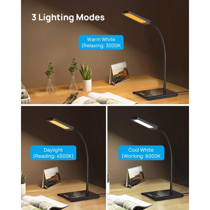 - 【3 Color Modes Task Lamp】: Long press the LED power indicator to activate 3 distinctive lighting modes. Choose the right color temperature with this desk lamp to meet your various lighting moods – Working 6000K, Reading 4500K, Relaxing 3000K.