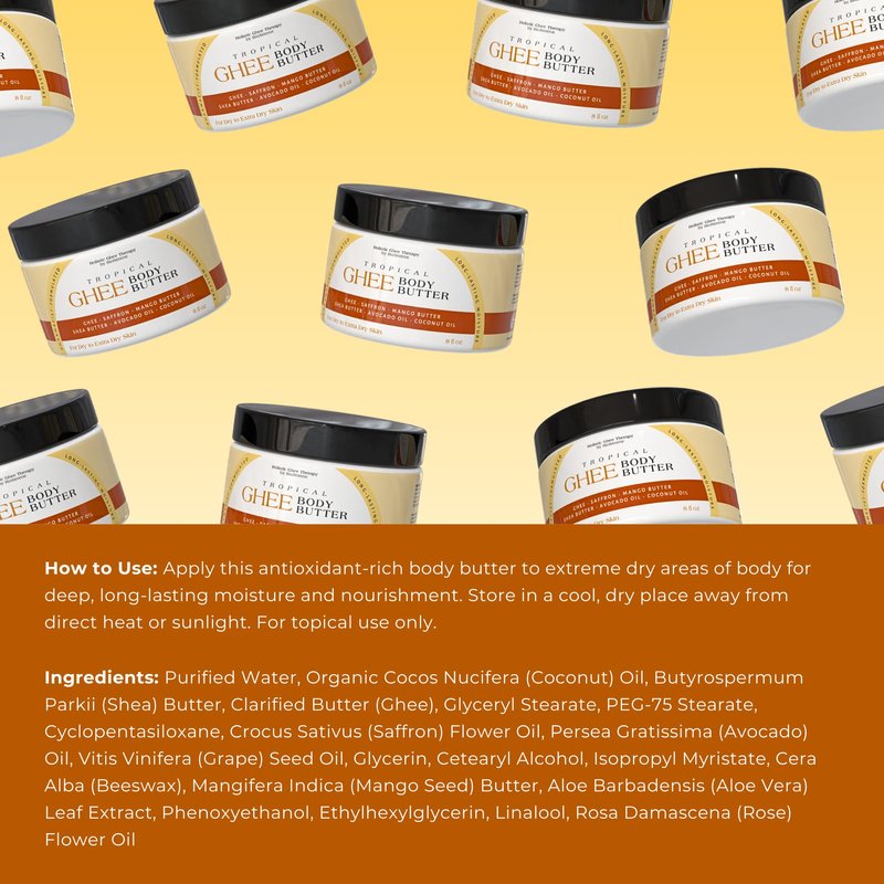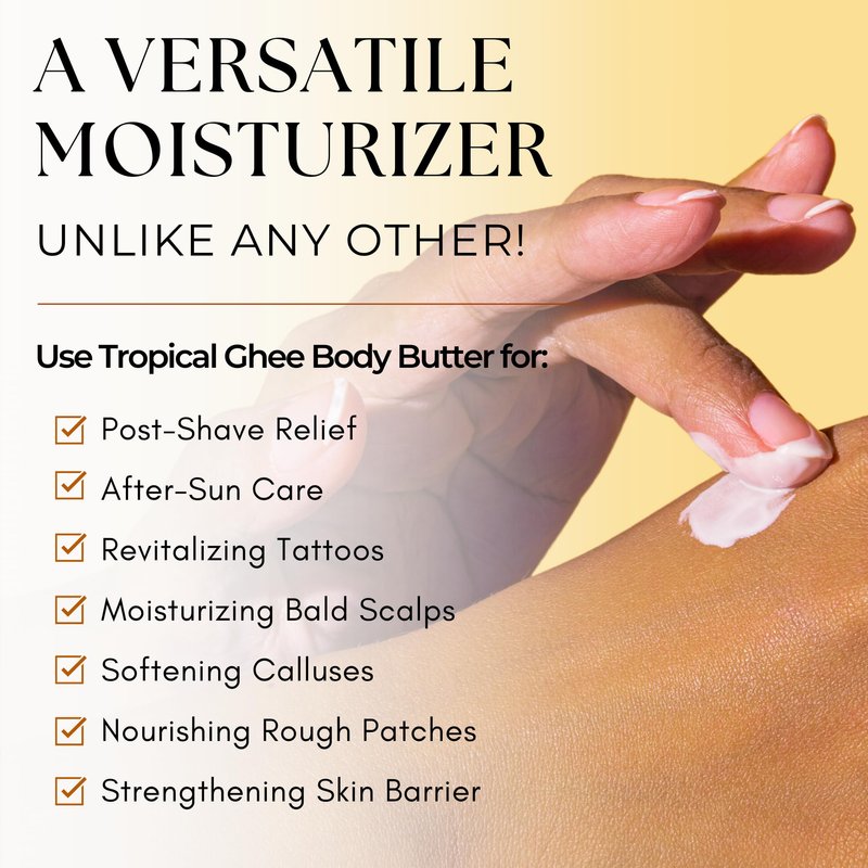 - ✅ Healing Properties: Tropical Ghee Body Moisturizer possess healing properties that aid in the recovery of minor wounds, burns, & skin irritations. It helps conditions like eczema, psoriasis, Sunburn