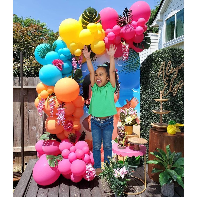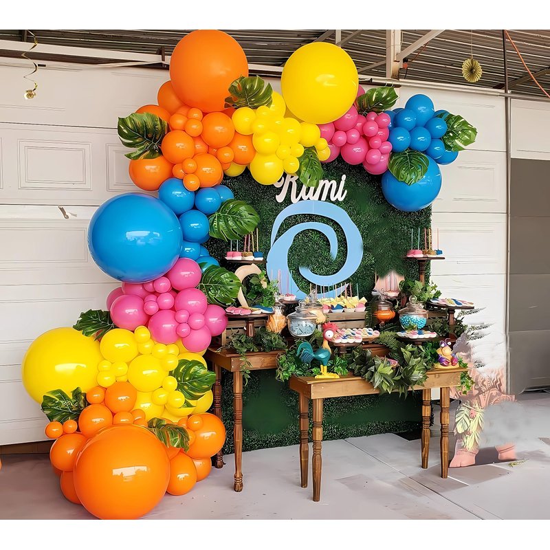 - The package includes: 8 pcs Palm Leaves, yellow latex balloons(10psc 10inches,15pcs 5inches,2pcs 18inches), orange latex balloons (10psc 10inches,15pcs 5inches,2pcs 18inches), red latex balloons (10psc 10inches,15pcs 5inches,2pcs 18inches), blue latex balloons ( 10psc 10inches,15pcs 5inches,2pcs 18inches), Whole Balloon Garland Accessories Kit (tape strip*1 + 100 dot glue*1 ).