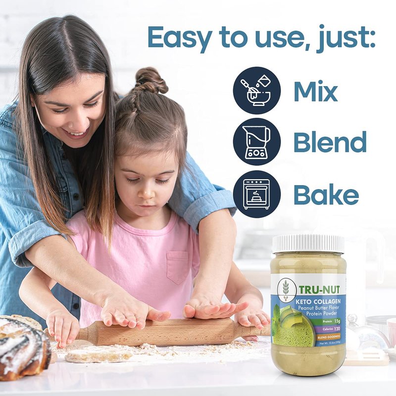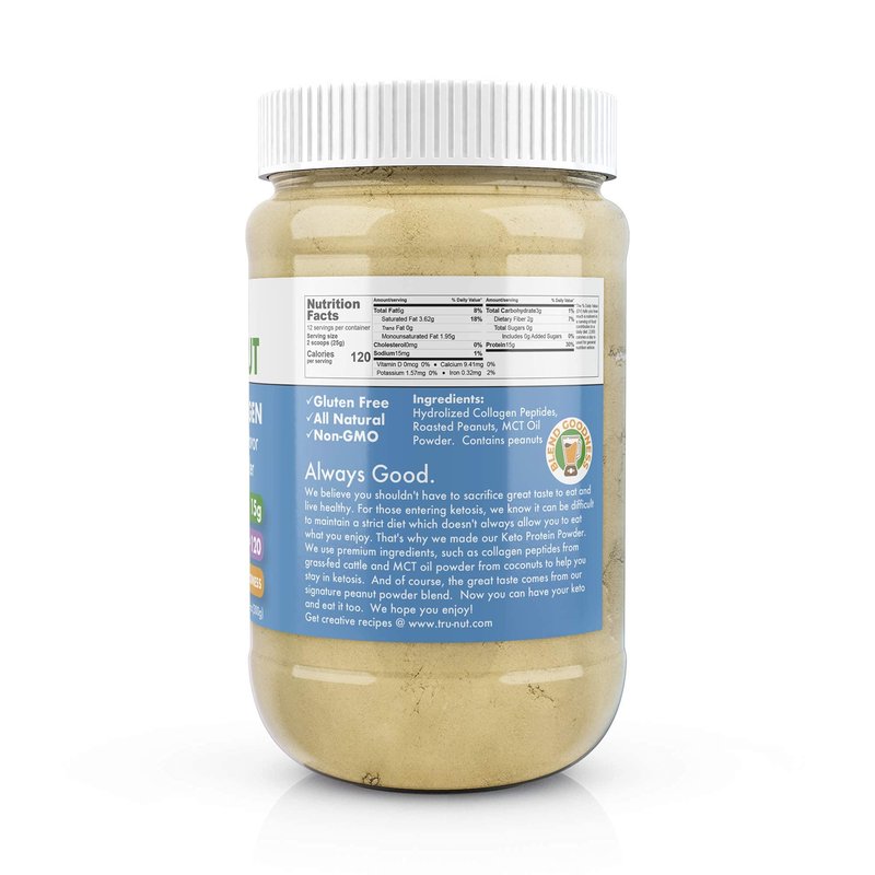 Tru-Nut Keto Collagen Peanut Butter Flavor Protein Powder is a delicious way to stay in ketosis and still enjoy the flavors you love. A powdered blend of hydrolyzed collagen peptides from grass-fed cattle, tasty roasted peanuts and keto-friendly MCT (medium-chain triglyceride) oil. Each serving delivers 15 g protein with zero sugar. MCT oil from coconuts is a great source of quick energy. Collagen supports healthy joints, skin and more. Add both to your healthy diet with Tru-Nut Keto Collagen.