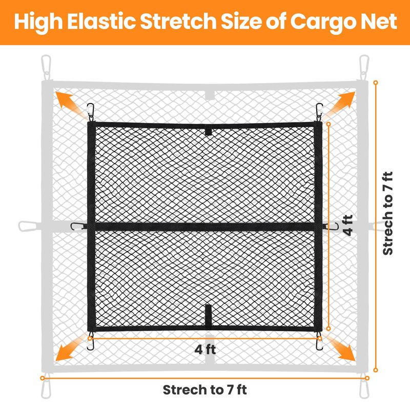 - 【Up to 2x Elastic Design】The highly elastic cargo net measures 4'x4' and can stretch up to 7'x7'. It is compatible with most pickup trucks, providing a versatile storage solution that lets you secure and store more items.