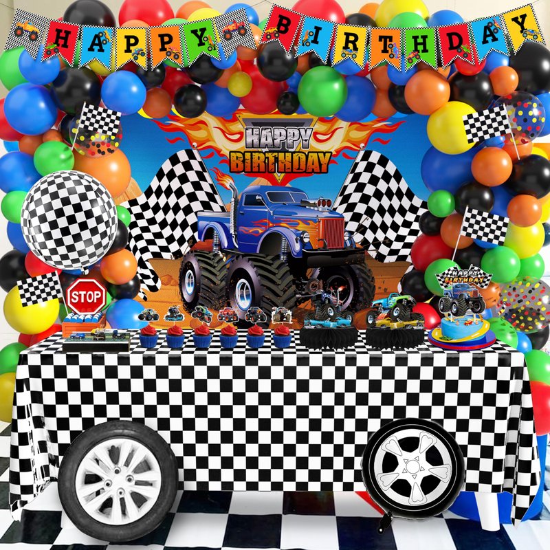 - Valuable Package: 1 truck themed backdrop, 1 tablecloth, 1 truck banner set, 1 triangle bunting banner, 1 HAPPY BIRTHDAY banner, 6 pcs flags, 1 happy birthday cake topper, 12 pcs cupcake toppers, 2 pcs honeycomb table centerpieces, 5 truck element foil balloons, 64 pcs latex balloons and 3 balloon tools. A set includes everything you need.