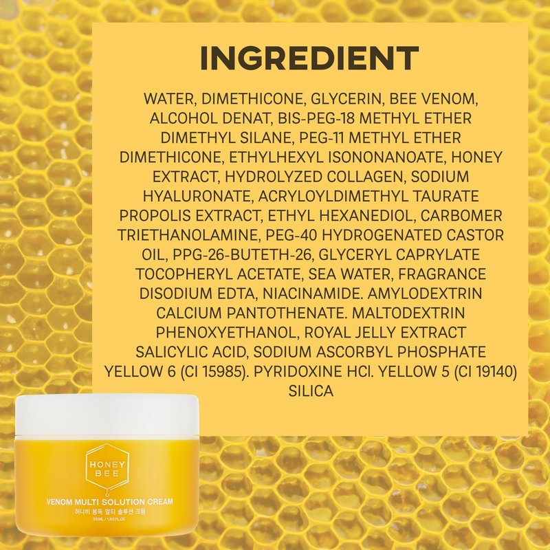 - BEE VENOM RADIANCE. Unlock the potent benefits of Bee Venom with our facial cream, formulated with 5% Honey Bee Venom for exceptional Korean skincare. This moisturizing cream enhances collagen production, resulting in firm and smooth skin.