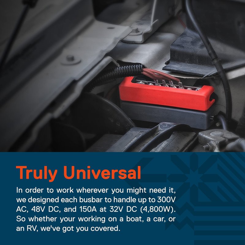 - TRULY UNIVERSAL - In order to work wherever you might need it, we designed each busbar to handle up to 300V AC, 48V DC, and 150A at 32V DC (4,800W). So whether your working on a boat, a car, or an RV, we've got you covered.