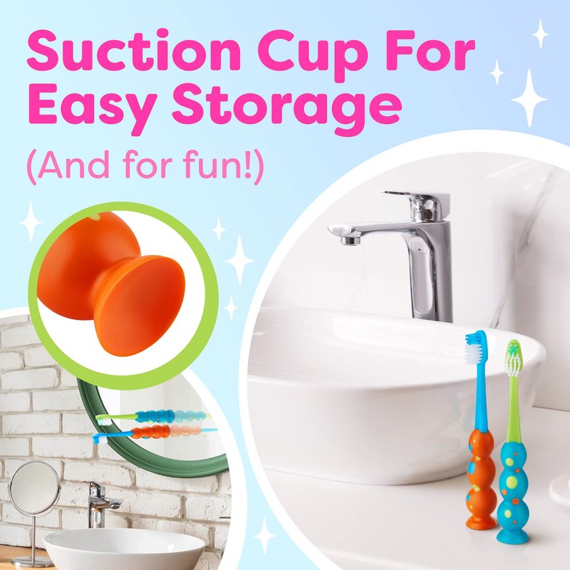 - A SUCTION CUP UNDERNEATH - It allows you to attach the children’s toothbrush to the sink, a mirror, or a shelf for it to always be at hand and never get lost for when the kid finally feels like going to brush their teeth—or, actually, is told to do so by the parents!