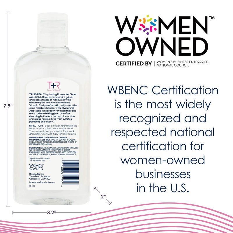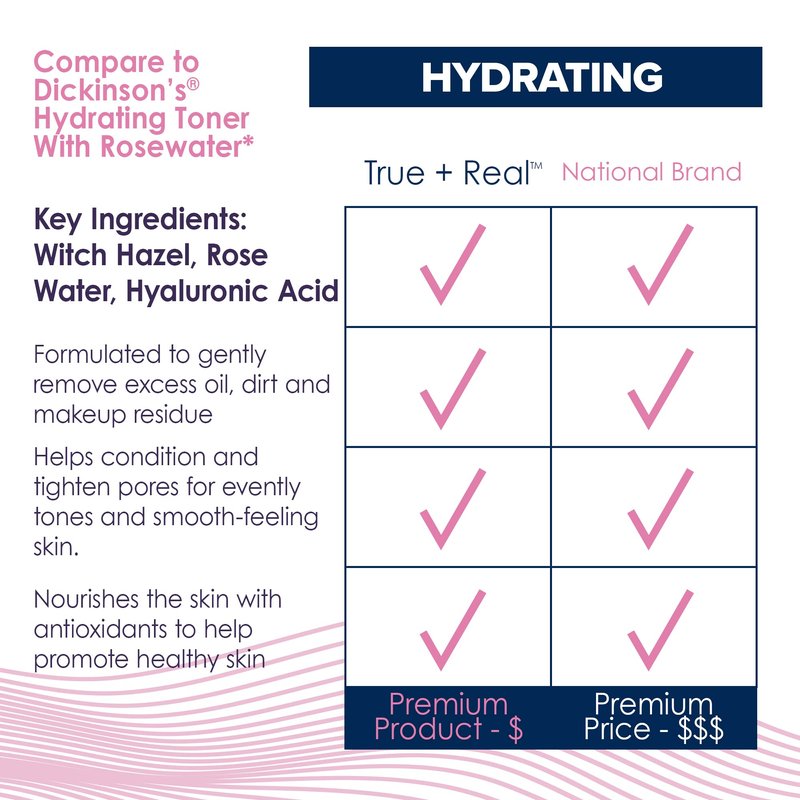- True+Real Rose Water Toner is naturally distilled, alcohol-free, non-drying formula to soothe, tone, and hydrate all skin types, gently removing excess oil, dirt, and makeup residue
